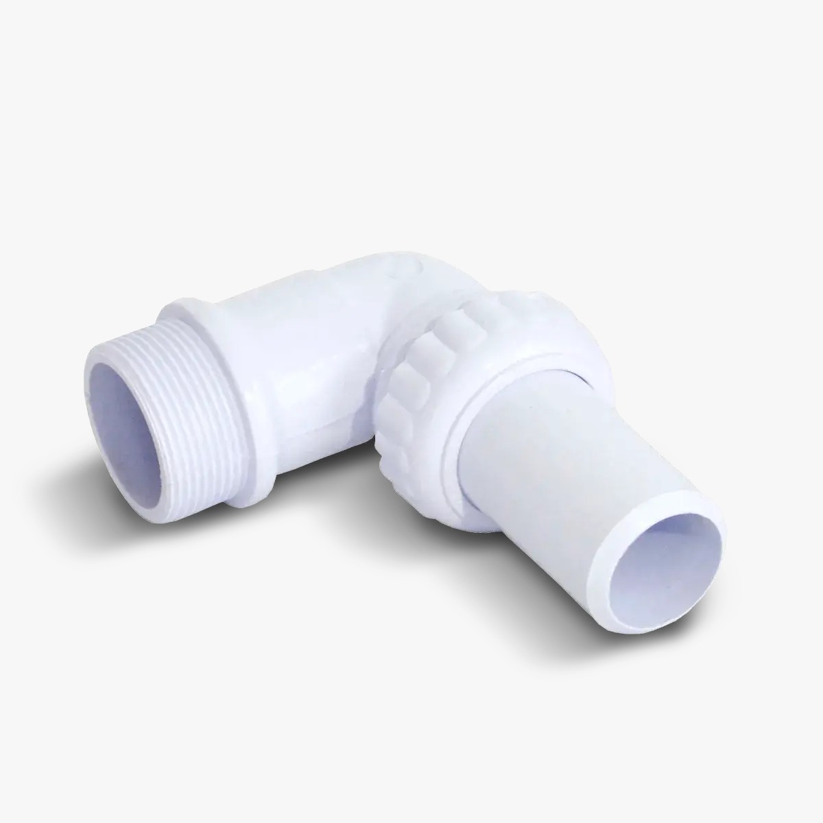 Acople rápido Vulcano. Liso en forma de codo de 90°, para caño de ø1 1/2". Se utiliza este accesorio para la conexión de: • Mangueras flotantes con limpiafondos. • Mangueras flotantes con virolas de aspiración. • Mangueras con bocas de impulsión de bombas. • Caños rígidos pegados y roscados entre sí. • Caños con válvulas componentes del circuito.