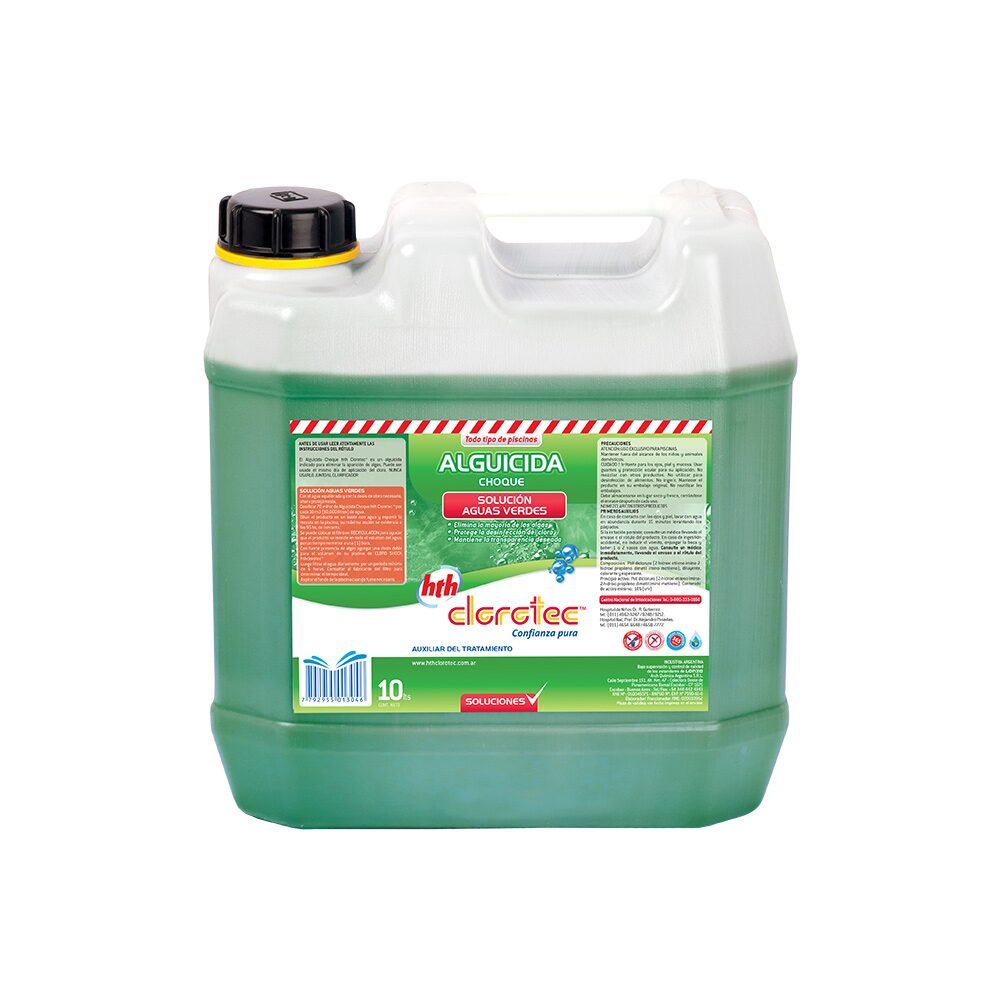 Alguicida choque para eliminar la mayoría de las algas, protege la desinfección del cloro, y mantiene la transparencia deseada. En envase de 10 litros. Con el agua equilibrada y con la dosis de cloro necesario, ahora protejámosla. Dosificar 70 ml/cc de Alguicida Choque hth Clorotec por cada 10m3(10.000litros) de agua. Diluir el producto en un balde con agua y esparcir la mezcla en la piscina, su máxima acción se evidencia a las 96hs. de contacto. Se puede colocar el filtro en RECIRCULACION para ayudar que el producto se mezcle en todo el volumen del agua, por un tiempo no menor a una (1) hora. Con fuerte presencia de algas agregar una dosis doble para el volumen de su piscina de CLOROSHOCK hthclorotec. Luego filtrar el agua diariamente por un período mínimo de 6 horas. Consultar al fabricante del filtro para determinar el tiempo ideal. Aspirar el fondo de la piscina cuando fuera necesario. ATENCION: USO EXCLUSIVO PARA PISCINAS. Mantener fuera del alcance de los niños y animales domésticos. ¡CUIDADO! Irritante para los ojos, piel y mucosa. Usar guantes y protección ocular para su aplicación. No mezclar con otros productos. No utilizar para desinfección de alimentos. No ingerir. Mantener el producto en su embalaje original. No reutilizar los embalajes. Debe almacenarse en lugar seco y fresco, cerrándose el envase después de cada uso. NO MEZCLAR CON OTROS PRODUCTOS. En caso de contacto con los ojos y piel, lavar con agua en abundancia durante 15 minutos levantando los párpados. Si la irritación persiste, consulte un médico llevando el envase o el rótulo del producto. En caso de ingestión accidental, no inducir el vómito, enjuagar la boca y beber 1 o 2 vasos con agua. Consulte un médico inmediatamente, llevando el envase o el rótulo del producto. Composición: Poli dicloruro (2-hidroxi etileno imino-2-hidroxi propileno dimetil imino metileno), diluyente, colorante y espesante. Principio activo: Poli dicloruro (2-hidroxi etileno imino-2-hidroxi propileno dimetil imino metileno). Contenido de activo mínimo: 18% (v/v)