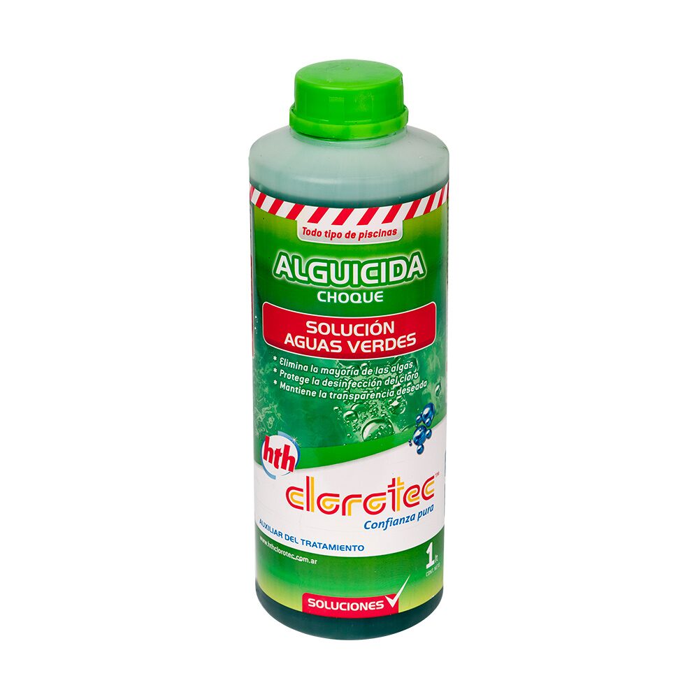 Alguicida choque para eliminar la mayoría de las algas, protege la desinfección del cloro, y mantiene la transparencia deseada. En botella de 1 litro. Con el agua equilibrada y con la dosis de cloro necesario, ahora protejámosla. Dosificar 70 ml/cc de Alguicida Choque hth Clorotec por cada 10m3(10.000litros) de agua. Diluir el producto en un balde con agua y esparcir la mezcla en la piscina, su máxima acción se evidencia a las 96hs. de contacto. Se puede colocar el filtro en RECIRCULACION para ayudar que el producto se mezcle en todo el volumen del agua, por un tiempo no menor a una (1) hora. Con fuerte presencia de algas agregar una dosis doble para el volumen de su piscina de CLOROSHOCK hthclorotec. Luego filtrar el agua diariamente por un período mínimo de 6 horas. Consultar al fabricante del filtro para determinar el tiempo ideal. Aspirar el fondo de la piscina cuando fuera necesario. ATENCION: USO EXCLUSIVO PARA PISCINAS. Mantener fuera del alcance de los niños y animales domésticos. ¡CUIDADO! Irritante para los ojos, piel y mucosa. Usar guantes y protección ocular para su aplicación. No mezclar con otros productos. No utilizar para desinfección de alimentos. No ingerir. Mantener el producto en su embalaje original. No reutilizar los embalajes. Debe almacenarse en lugar seco y fresco, cerrándose el envase después de cada uso. NO MEZCLAR CON OTROS PRODUCTOS. En caso de contacto con los ojos y piel, lavar con agua en abundancia durante 15 minutos levantando los párpados. Si la irritación persiste, consulte un médico llevando el envase o el rótulo del producto. En caso de ingestión accidental, no inducir el vómito, enjuagar la boca y beber 1 o 2 vasos con agua. Consulte un médico inmediatamente, llevando el envase o el rótulo del producto. Composición: Poli dicloruro (2-hidroxi etileno imino-2-hidroxi propileno dimetil imino metileno), diluyente, colorante y espesante. Principio activo: Poli dicloruro (2-hidroxi etileno imino-2-hidroxi propileno dimetil imino metileno). Contenido de activo mínimo: 18% (v/v)