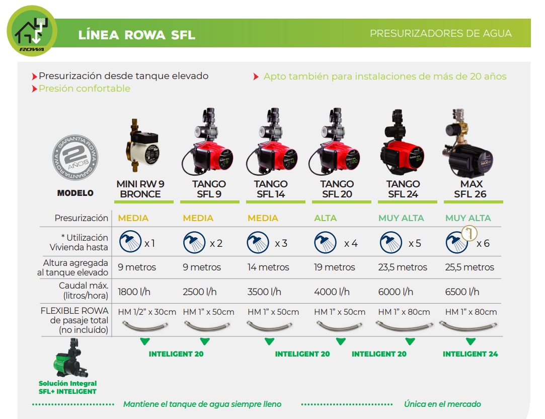 Aumento de presión de agua en residencias en general, nuevas o antiguas con tanque elevado. Apto para viviendas con tuberías de 20 años o más, para hasta 2 Consumos (duchas, canillas, lavavajillas u otros). No presuriza la instalación en forma continua, solamente cuando se consume más de 1 litro de agua por minuto, no produce golpes de ariete. Su motor es totalmente silencioso, bobinado protegido contra funcionamiento en seco, se apaga automáticamente y posee protector térmico incorporado. **Los consumos indicados refieren a duchas estándar; para modelos de gran diámetro o escocesas, se debe seleccionar una bomba de mayor potencia.