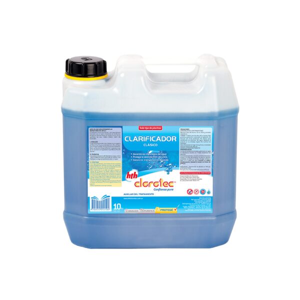 Clarificador clásico para decantar las impurezas del agua, proteger la desinfección del cloro y generar la transparencia deseada. En envase de 10 litros. Con el agua equilibrada y con la dosis de cloro necesario, ahora protejámosla. Dosificar 50 ml/cc de Clarificador Clásico hth Clorotec™ por cada 10 m3 (10.000 litros) de agua. 250 cc/ml actúan en 50 m3 (50.000lt). Diluir el producto en un balde con agua y esparcir la mezcla en la piscina. Se puede colocar el filtro en RECIRCULACION para ayudar que el producto se mezcle en todo el volumen del agua, por un tiempo no menor a una (1) hora. Luego filtrar el agua diariamente por un período mínimo de 6 horas. Consultar al fabricante del filtro para determinar el tiempo ideal. Idealmente aplicarlo luego del uso de la piscina. Pasado el tiempo de actuación (6 a 8hs) aspirar el fondo de la piscina. Utilizar el producto una vez por semana. ATENCION: USO EXCLUSIVO PARA PISCINAS. Mantener fuera del alcance de los niños y animales domésticos. ¡CUIDADO! Irritante para los ojos, piel y mucosa. Usar guantes y protección ocular para su aplicación. No mezclar con otros productos. No utilizar para desinfección de alimentos. No ingerir. Mantener el producto en su embalaje original. No reutilizar los embalajes. Debe almacenarse en lugar seco y fresco, cerrándose el envase después de cada uso. NO MEZCLAR CON OTROS PRODUCTOS. En caso de contacto con los ojos y piel, lavar con agua en abundancia durante 15 minutos levantando los párpados. Si la irritación persiste, consulte un médico llevando el envase o el rótulo del producto. En caso de ingestión accidental, no inducir el vómito, enjuagar la boca y beber 1 o 2 vasos con agua. Consulte un médico inmediatamente, llevando el envase o el rótulo del producto. Composición: Clorhidroxido de Aluminio al 50% p/p 27,5% inertes 72,5% Principio activo: Clorhidroxido de Aluminio al 50% p/p "