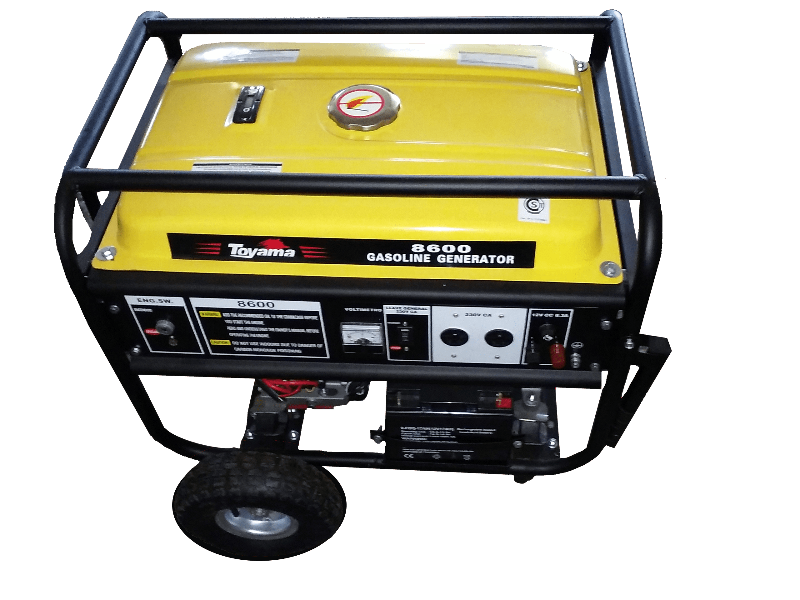 Generador Eléctrico | Grupo Electrógeno Naftero TOYAMA® 8600 (Incluye batería). Toyama® es una amplia línea de productos motorizados en 2 y 4 tiempos, fabricados en China.Con un permanente incremento en su posicionamiento y su evolución técnica; la línea de productos Toyama® comprende en su diversas potencias y prestaciones: Generadores, Bombas, Motosierras, Motoguadañas, Pulverizadores, Hoyadoras, Sopladores y sus correspondientes líneas de repuestos y accesorios. Indicados para un uso ocasional o privado, con una excelente relación costo/beneficio.