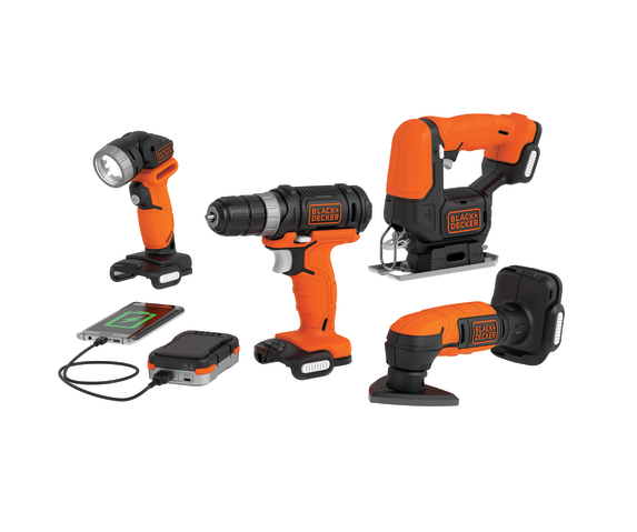 Estas 4 herramientas inalámbricas esenciales le permiten cortar, lijar, taladrar y tener una linterna a mano. La batería GoPak 2 en 1 cuenta con una salida USB para alimentar dispositivos móviles. El kit incluye un taladro / destornillador, una sierra de calar, una lijadora y una linterna LED. Enfréntate a proyectos desde artesanías en madera hasta relojes de paletas y otras decoraciones para el hogar. Este kit es perfecto como primer conjunto de herramientas eléctricas o para el fabricante experimentado. Características: Batería: la batería GoPak 2 en 1 alimenta sus herramientas y carga sus dispositivos móviles Batería: la salida USB de 2.4 Ah proporciona una carga rápida a teléfonos, tabletas y otros dispositivos USB Batería: 4 luces LED proporcionan el estado de carga de la batería Batería: diseño compacto y liviano para portabilidad móvil Taladro: el embrague de 11 posiciones en el taladro / destornillador evita la extracción de tornillos y materiales dañinos, la luz de trabajo LED en el taladro / destornillador ilumina la superficie de trabajo Rompecabezas: liberación de la cuchilla sin herramientas en la sierra de calar para cambios rápidos y fáciles de la cuchilla Sierra de calar: Almacenamiento de hoja incorporado en la sierra de calar para mayor comodidad Lijadora: placa triangular de 3.5 pulg. En la lijadora para acceder a esquinas y espacios reducidos Luz LED: cabezal giratorio de 90 grados en una linterna LED para acceder a ángulos difíciles de alcanzar CAPACIDAD Salida USB 1.5Ah / 2.4A TAMAÑO DE CHUCK 3/8 " LÚMENES 50 NUMERO DE HERRAMIENTAS 4 4 ÓRBITAS / MIN. 11000 OPM TIPO DE HERRAMIENTA ELÉCTRICA Sin cable TIPO DE PRODUCTO INCLUIDO Taladro, Sierra caladora, Lijadora, Luz de trabajo RPM 0-550 RPM LONGITUD DE LA CARRERA 5/8 " GOLPES / MIN 0-2800 rpm INCLUYE (1) Taladro / destornillador BCD701 (1) Rompecabezas BCS601 (1) Lijadora de detalles BCW201 (1) BCL101 Luz LED (1) Batería BCB001 GoPak (1) cable de carga microUSB (1) Bit de controlador de doble punta (1) Hoja de rompecabezas (3) hojas de papel de lija