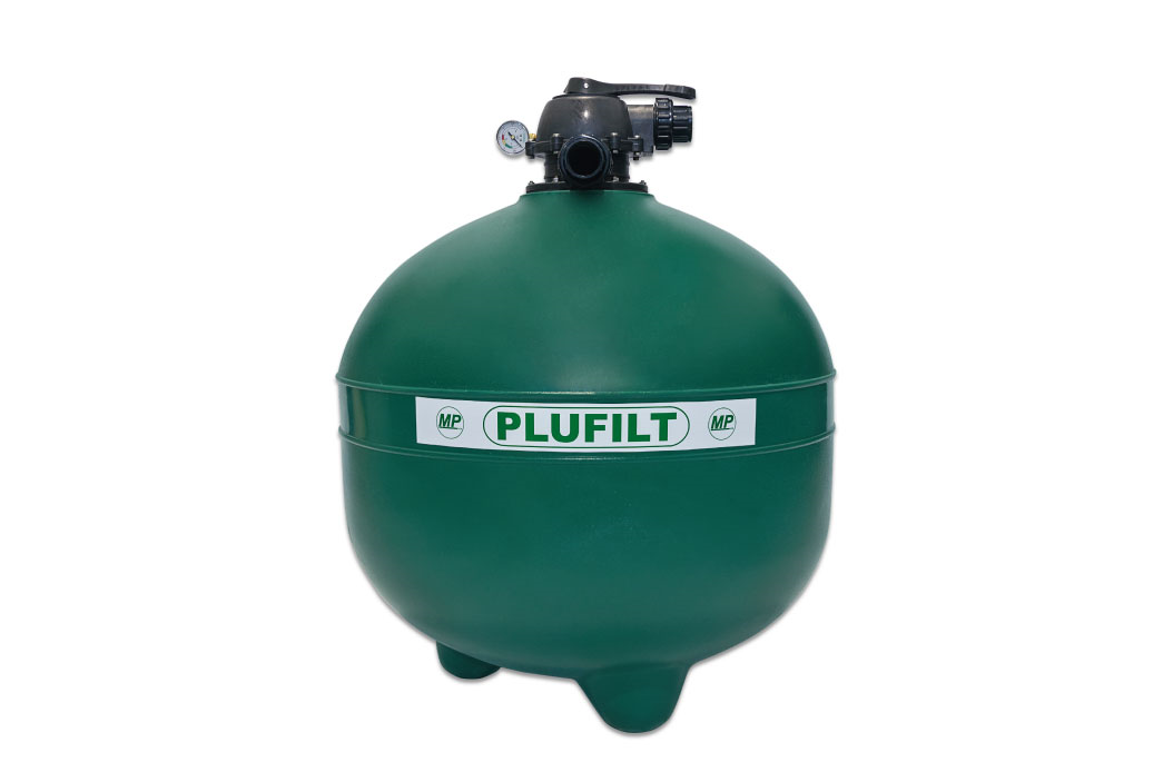 Los filtros PLUFILT están constituidos por: Tanque monoblock rotomoldeado en material termoplástico con protección UV Sistema colector interno de alto rendimiento Brida interna de bronce con bulonería de acero inoxidable que garantiza un excelente anclaje de la válvula selectora al tanque Válvula selectora multivía de seis posiciones, con visor de retrolavado, manómetro y uniones dobles que facilitan su instalación El conjunto se completa con carga de arena filtrante de granulometría clasificada y seleccionada Los materiales utilizados en su fabricación son totalmente a prueba de corrosión lo cual garantiza una mayor durabilidad y simplicidad en la conservación y mantenimiento de los mismos. Los Filtros PLUFILT Serie MP son aptos para filtrar piscinas de volúmenes comprendidos entre los 30.000 Lts hasta los 300.000 Lts y con posibilidad de ampliar, utilizando los mismos en batería, según sea el requerimiento. El equipo de filtrado se complementa con bombas autocebantes con prefiltro.